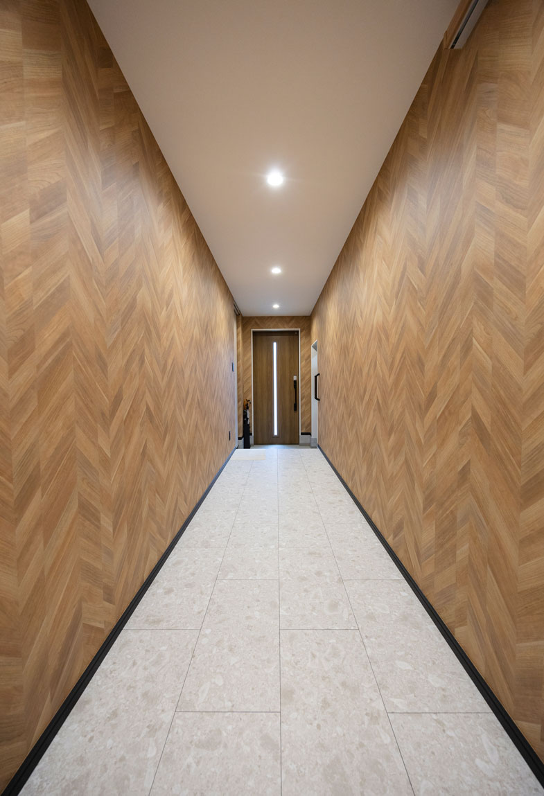 1階には、二つの玄関とガレージ。内側は広い廊下でつながっています
