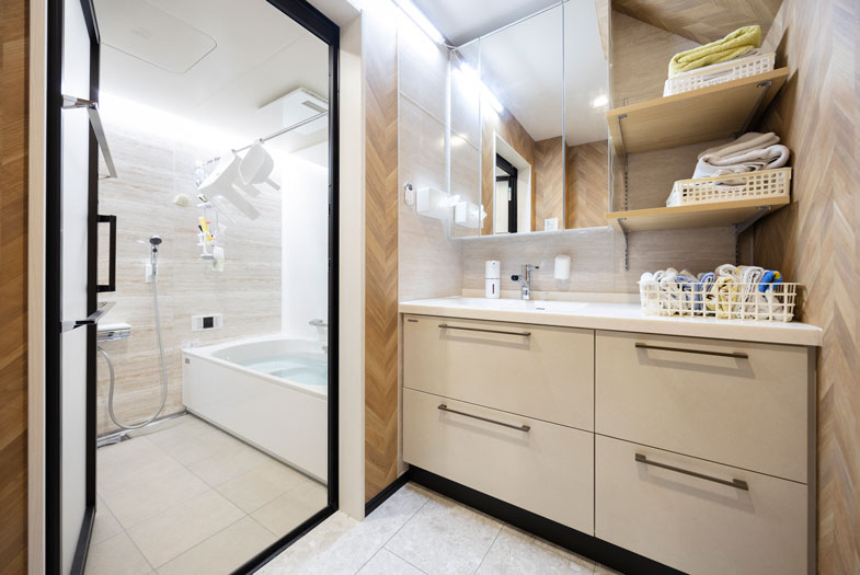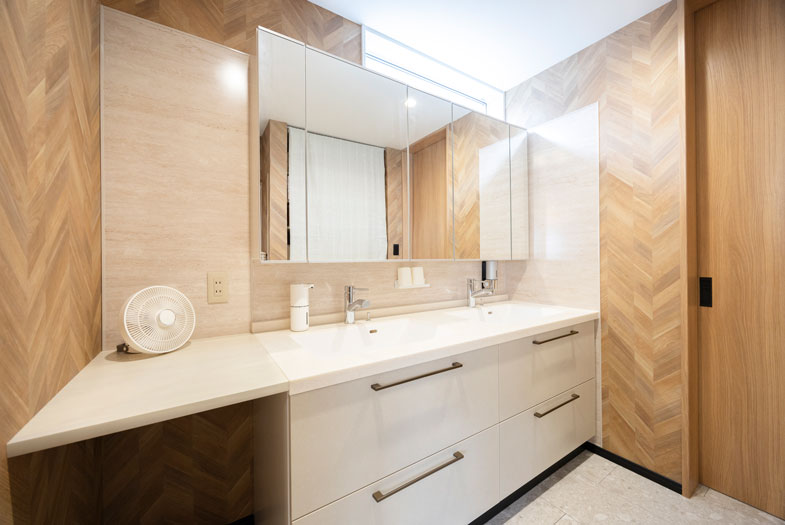 階段からリビングの途中にある洗面スペース。洗面台も2台ならんでいます