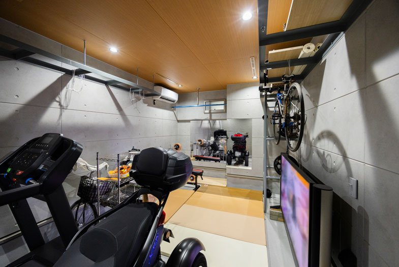 ガレージの中は、バイクやトレッドミル・トレーニング器具など、ご主人のためのスペースです