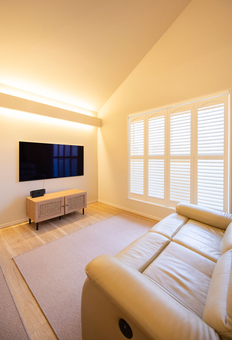 リビングはテレビの上に間接照明をつけることで、ホームシアターのような雰囲気に