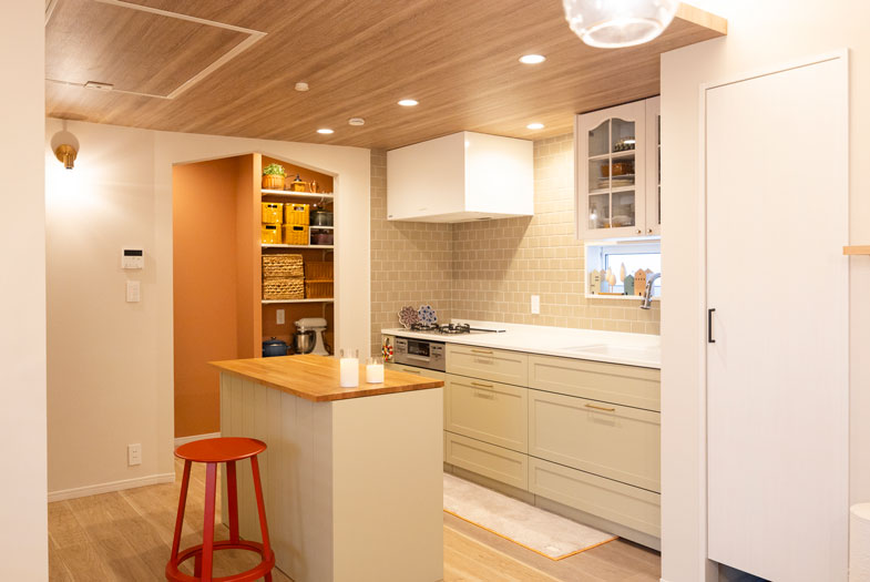 I型キッチンとアイランド型の作業台を組み合わせたキッチン。奥にはパントリーも