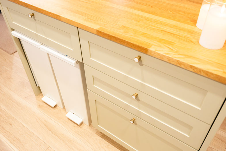 作業台の下は収納用の引き出しとダストボックス用のスペースになっています