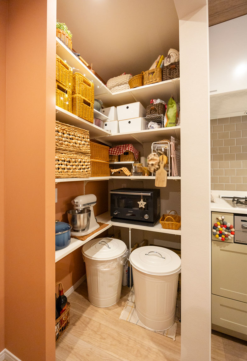 パントリーの奥には、食品のストックから調理家電までが収まる可動棚
