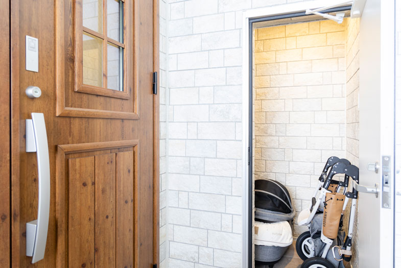 玄関外にも収納スペース。犬の散歩グッズなどがしまわれています