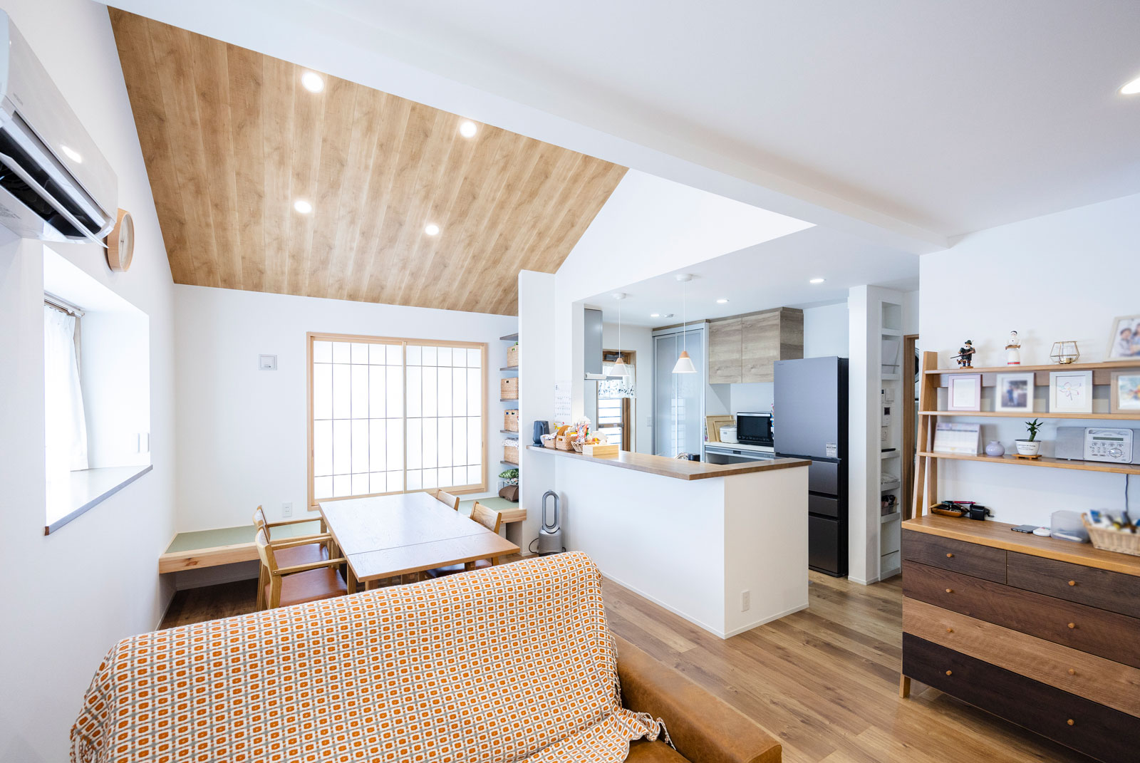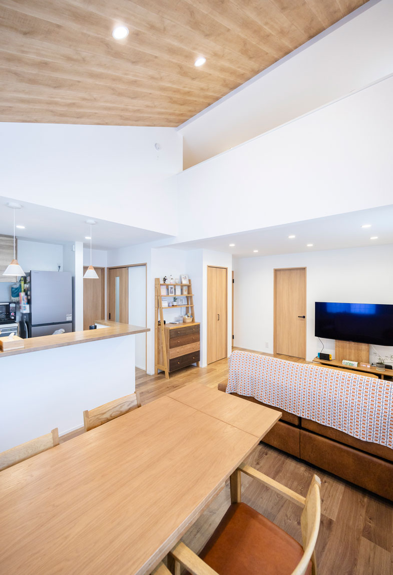 ダイニングの頭上は勾配天井。リビングの上の部分がロフトにあたります