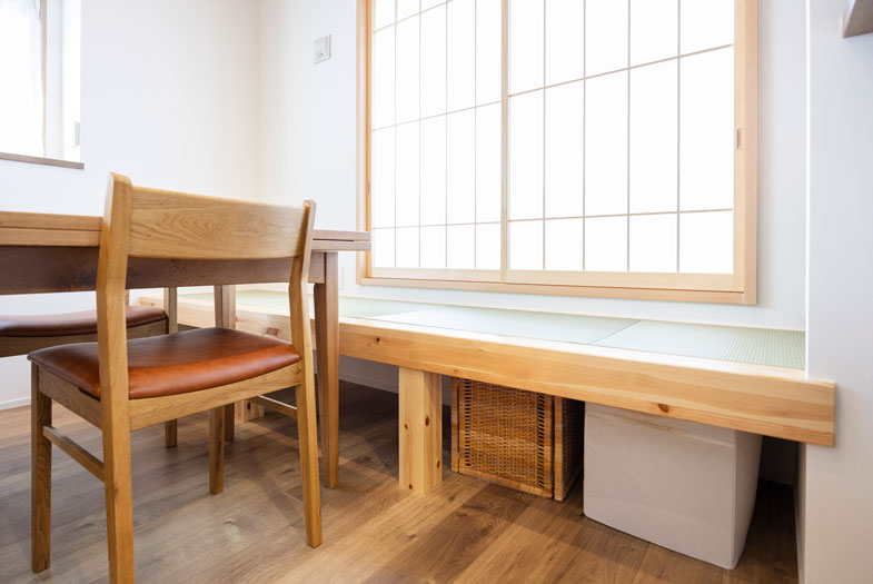座ったり、横にもなれる畳ベンチ。下は収納スペースにもなっています
