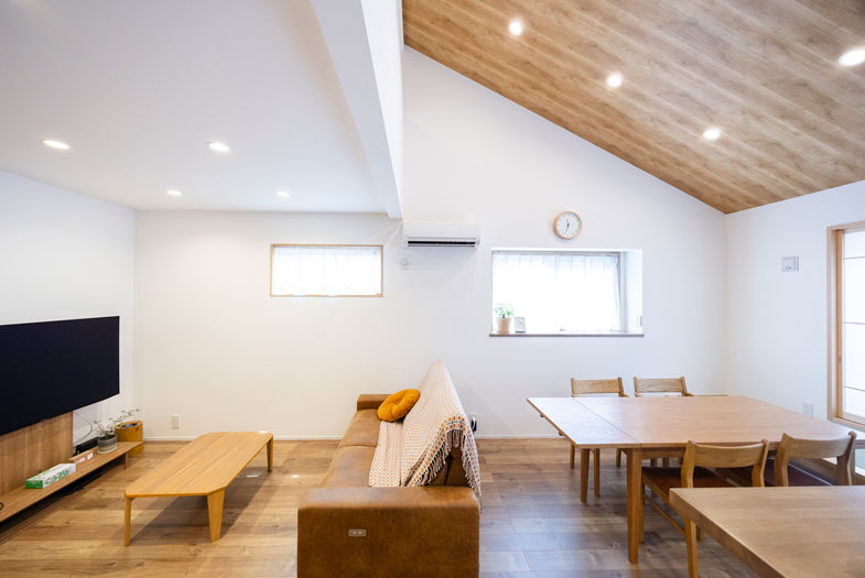家づくりには、妻が新居のイメージを具体化するために雑誌の切り抜きやインターネットで見つけた画像を貼り付けていた、“アイデアノート”が大活躍!打ち合わせの際にも、言葉で説明するよりもスムーズに、イメージを共有することができました。また、注文住宅の打ち合わせには長い期間を要するので、話したことを忘れないように記録としても活用しました。 家の中で特に気に入っているのは、ダイニングの「畳ベンチ」です。もともとは和室が欲しかったのですがスペース的に難しく、そこでLDKの一角を小上がりの畳ベンチにしてもらいました。これはたいへん居心地がよく、子どもたちが本を読んだり夫婦でくつろいだりと、家の中でも自然と家族が集まるコミュニケーションの中心地となっています。室内全体としても、白を基調としたクロスに、床材や勾配天井、扉などに木目調のものを選んでおり、ナチュラルで明るい雰囲気になっているのもイメージ通りです。