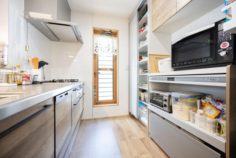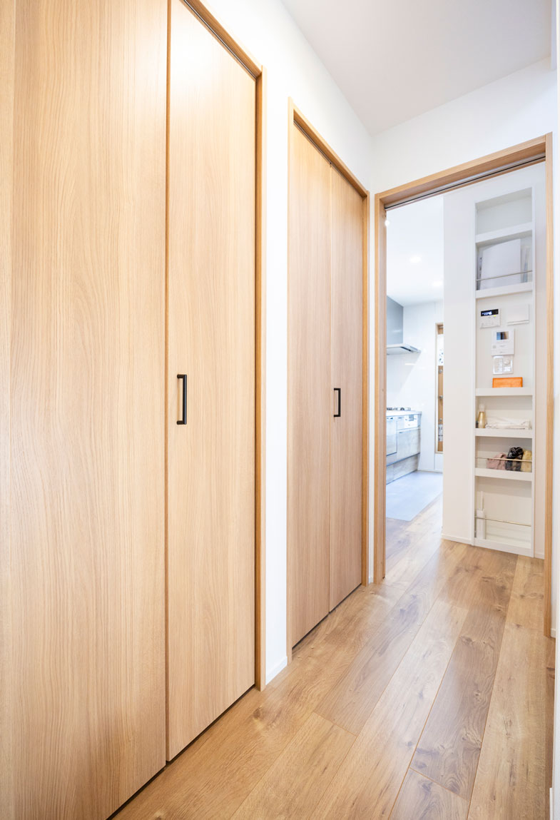 廊下には収納スペース、キッチンの壁にはニッチなど、スペースを有効活用