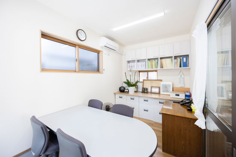 ガラス扉で仕切られた奥には、契約や打ち合わせ用の個室も配置されています